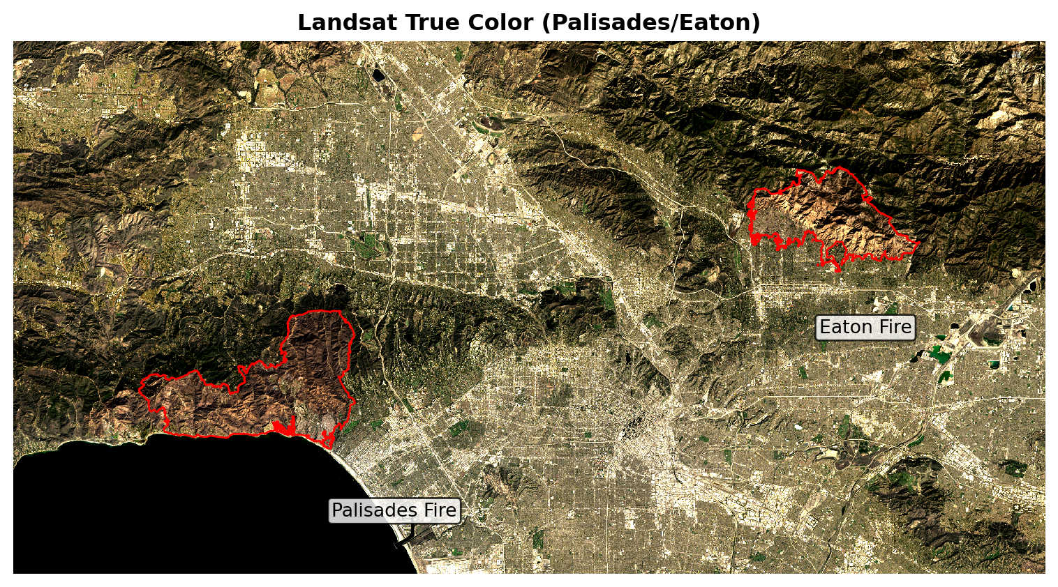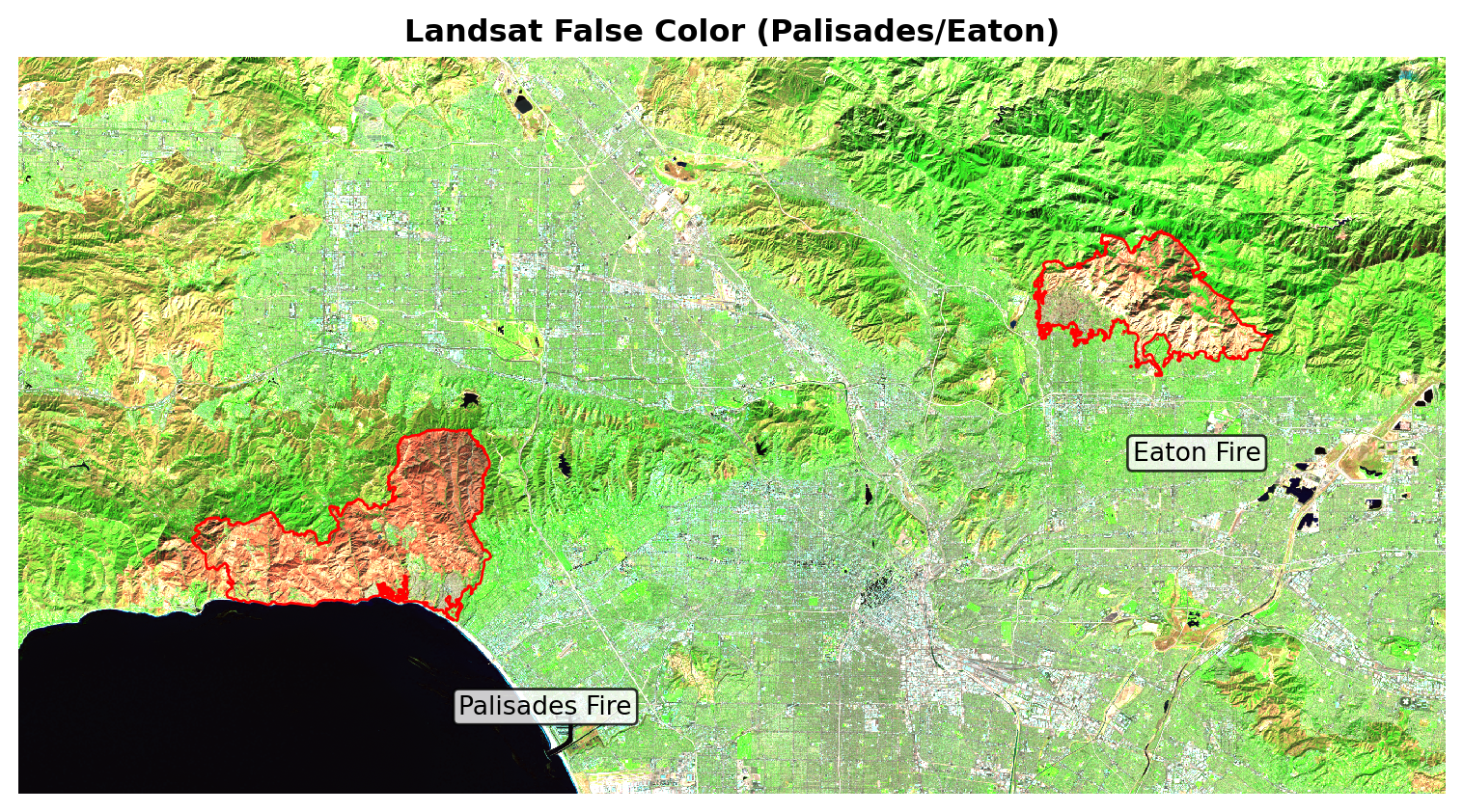 This makes burned areas stand out more clearly. We then reproject the fire perimeters to the Landsat CRS, overlay them in red, and label each fire so the false-color composite directly highlights where and how severely the Palisades and Eaton fires affected the landscape.