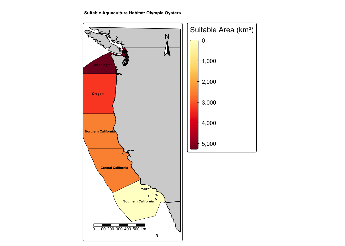 Figure 2: Habitat suitability for Olympia oyster aquaculture. Washington’s cooler waters provide the most suitable conditions for this native species.